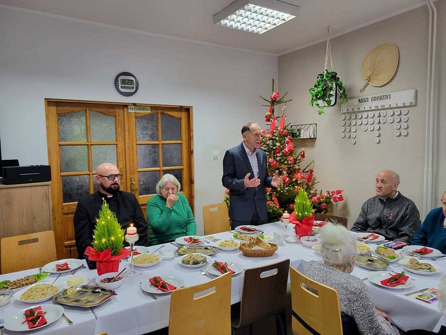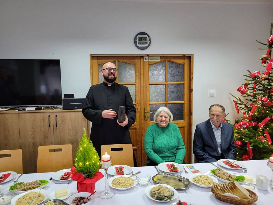 Po serdecznym powitaniu gości przyszedł czas na słowo Boże, wspólne życzenia oraz dzielenie się opłatkiem. Następnie zasiedliśmy do pięknie nakrytych stołów, by skosztować tradycyjnych potraw wigilijnych.